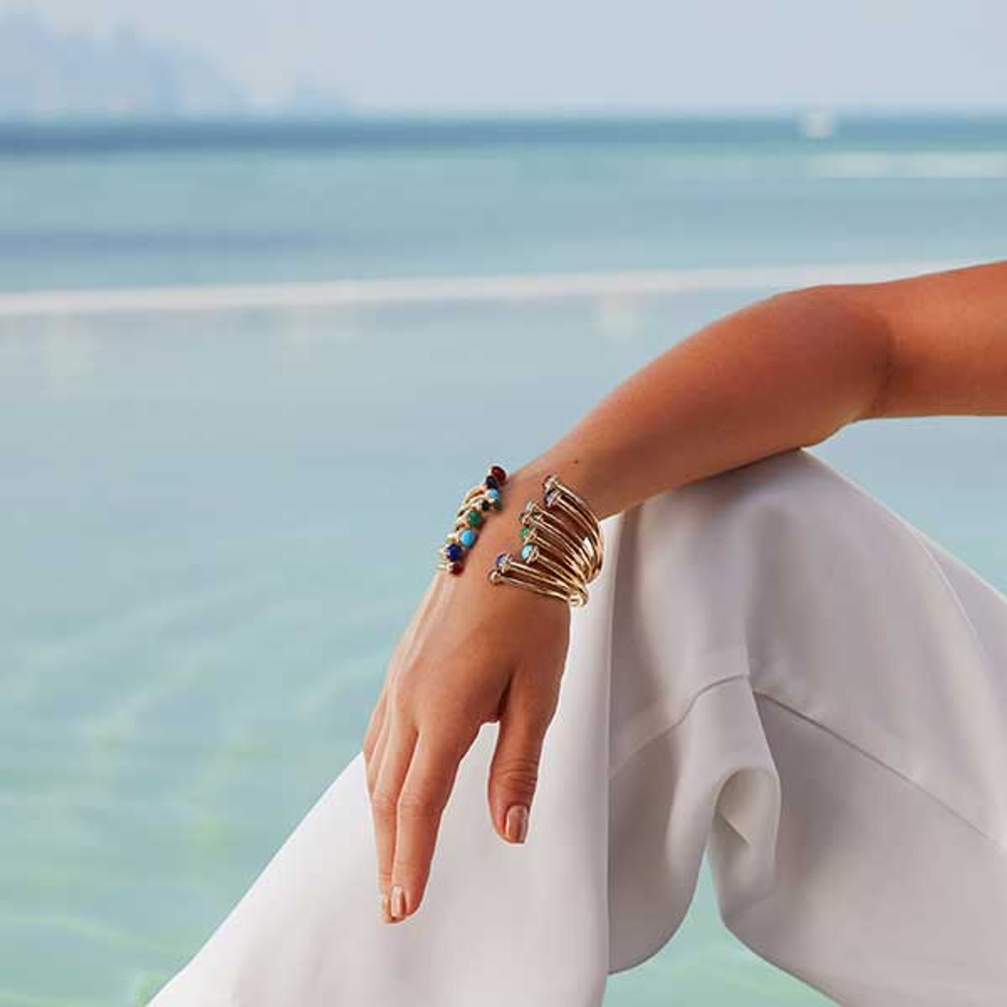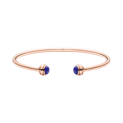 Possession bracelet in rose gold decorated with two blue lapis lazuli cabochons. On this elegant open bangle bracelet, the Possession collection's iconic rings are enhanced with colour, warmed by the natural beauty of ornamental stones. Placed at either end of this luxurious open bangle bracelet in rose gold and embellished with deep blue lapis lazuli cabochons, Piaget's captivating turning rings adorn the wrist with an elegant touch of colour. Worn alone or stacked, this Possession open bangle bracelet in rose gold and lapis lazuli promises to be a dynamic and energising companion for any woman.