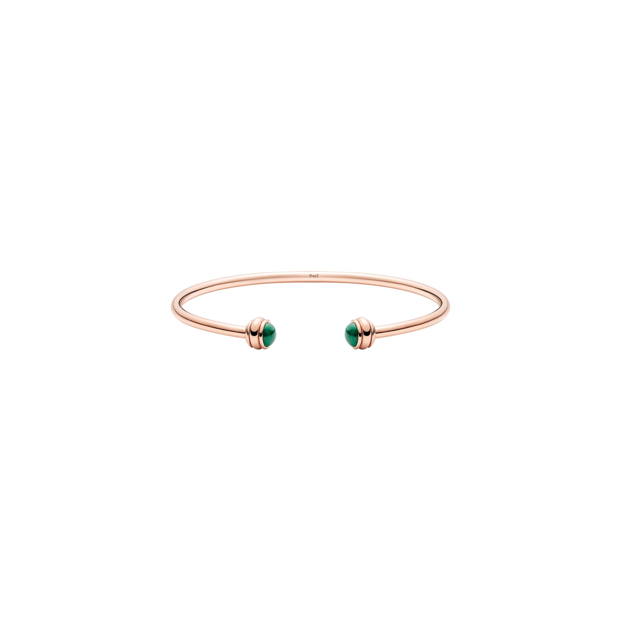 Possession bracelet in rose gold decorated with two green malachite cabochons. On this elegant open bangle bracelet, the Possession collection's iconic rings are enhanced with colour, warmed by the natural beauty of ornamental stones. Placed at either end of this luxurious open bangle bracelet in rose gold and embellished with daring green malachite cabochons, Piaget's captivating turning rings adorn the wrist with an elegant touch of colour. Worn alone or stacked, this Possession open bangle bracelet in rose gold and malachite promises to be a dynamic and energising companion.